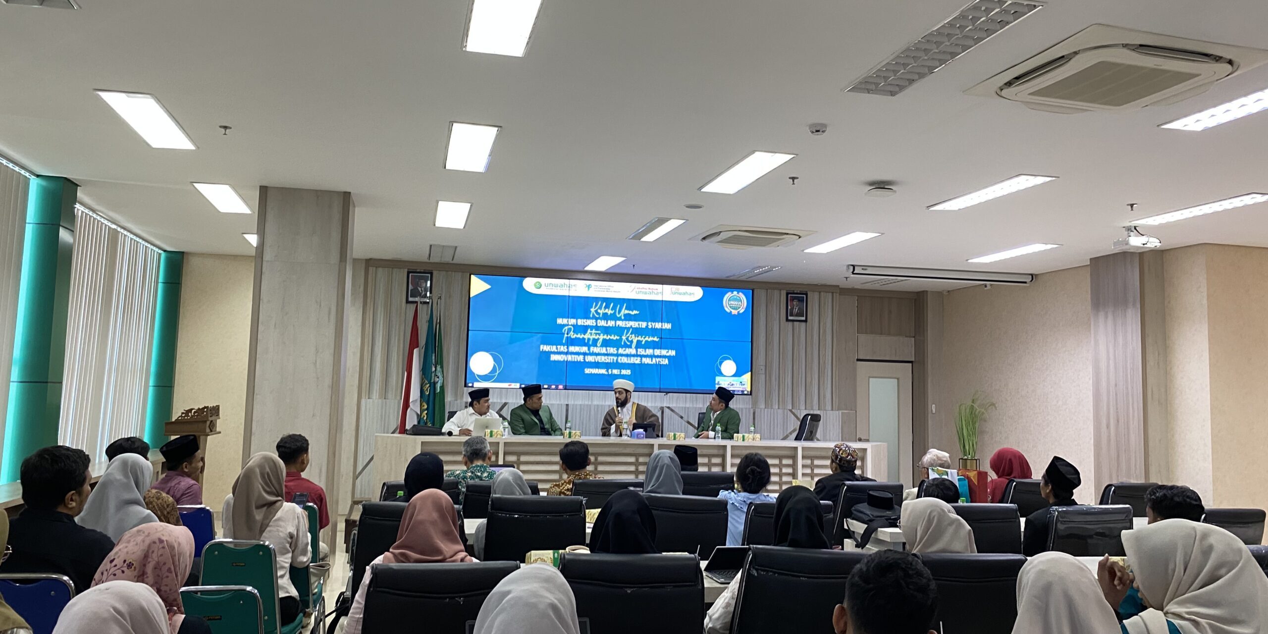 Semarang, Senin, tanggal 5 Mei 2025, Program Studi Hukum Ekonomi Syari’ah FAI Unwahas melaksanakan kegiatan Kuliah Umum dengan tema “Hukum Bisnis dalam Perspektif Syari’ah” yang dirangkaikan dengan agenda Penandatanganan Nota Kesepahaman (MoU) antara Fakultas Hukum dan Fakultas Agama Islam Universitas Wahid Hasyim (Unwahas) dengan Innovative University College Malaysia. Kegiatan ini berlangsung secara hybrid (luring dan daring) bertempat di Aula Gedung Dekanat Lantai 6, Universitas Wahid Hasyim, mulai pukul 13.00 WIB hingga selesai.